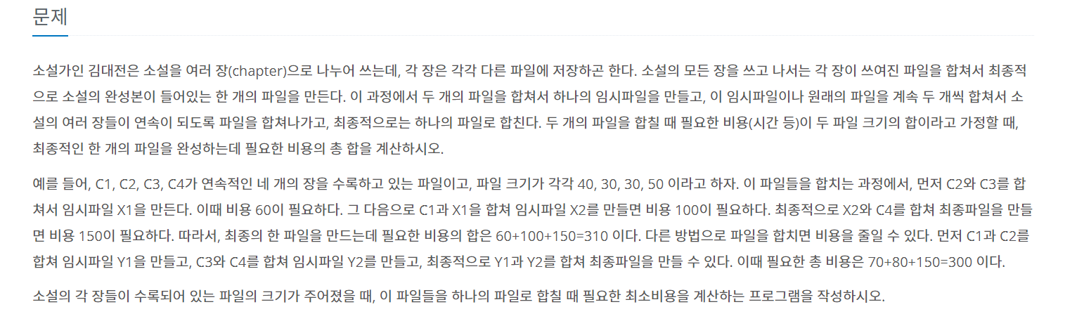 먼저 고려해야할 것은 인접된 파일들만 겹칠 수 있다는 점입니다. 따라서 정렬을 한 뒤 합치는등, 배열을 섞으면 안됩니다. 따라서 메모리제이션을 통해서 DP를 풀어나가야 한다는 것입니다.