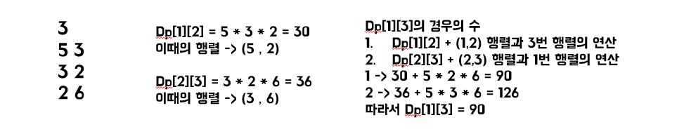 예를 들어, Dp[1][3] (1번부터 3번 행렬까지의 최소 연산 횟수)를 구하기 위해서는