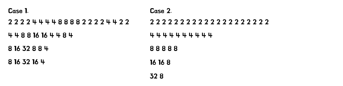 첫째 줄에 보드의 크기 N (1 ≤ N ≤ 20)이 주어진다. 둘째 줄부터 N개의 줄에는 게임판의 초기 상태가 주어진다. 0은 빈 칸을 나타내며, 이외의 값은 모두 블록을 나타낸다. 블록에 쓰여 있는 수는 2