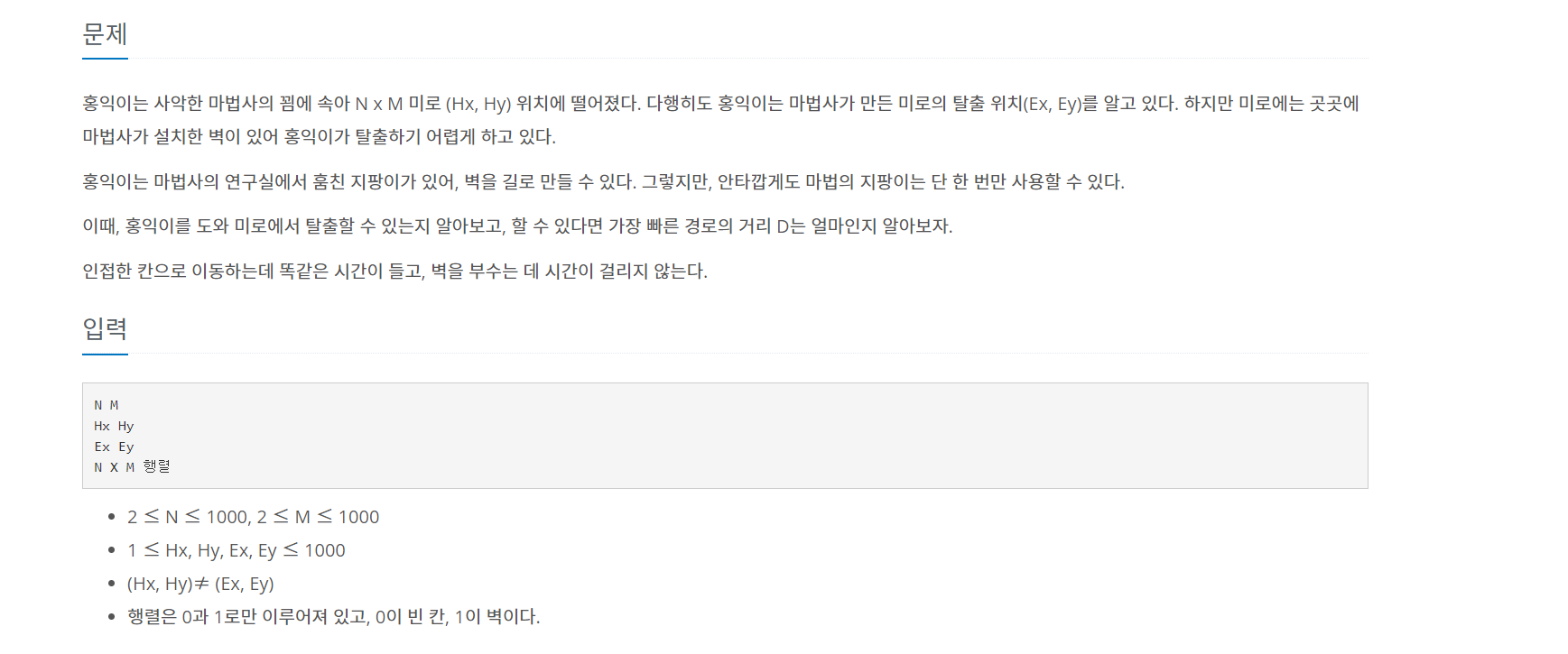 홍익이는 사악한 마법사의 꾐에 속아 N x M 미로 (Hx, Hy) 위치에 떨어졌다. 다행히도 홍익이는 마법사가 만든 미로의 탈출 위치(Ex, Ey)를 알고 있다. 하지만 미로에는 곳곳에 마법사가 설치한 벽이