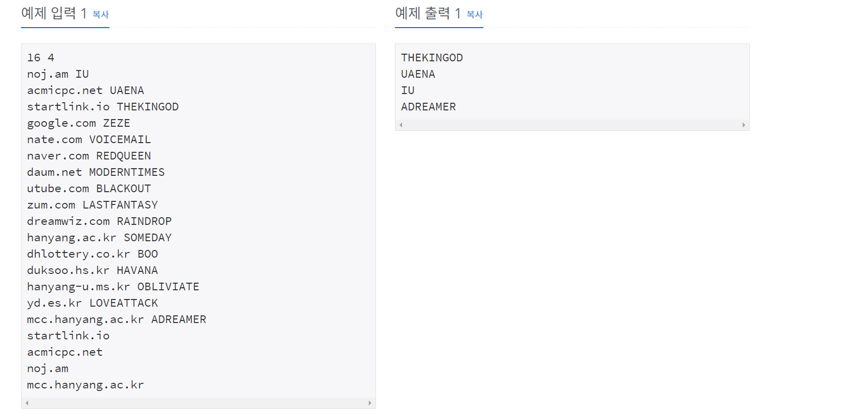 첫째 줄에 저장된 사이트 주소의 수 N(1 ≤ N ≤ 100,000)과 비밀번호를 찾으려는 사이트 주소의 수 M(1 ≤ M ≤ 100,000)이 주어진다. 두번째 줄부터 N개의 줄에 걸쳐 각 줄에 사이트 주소와 비밀번