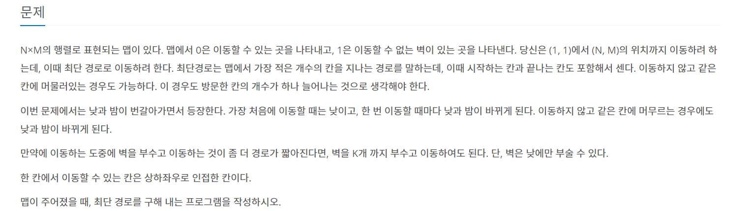 기존 벽 부수기 문제와는 다르게 밤과 낮 기능이 추가된 문제였습니다.