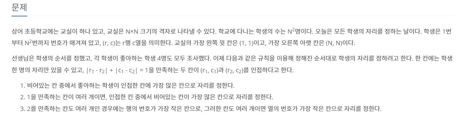 상어 초등학교에는 교실이 하나 있고, 교실은 N×N 크기의 격자로 나타낼 수 있다. 학교에 다니는 학생의 수는 N2명이다. 오늘은 모든 학생의 자리를 정하는 날이다. 학생은 1번부터 N2번까지 번호