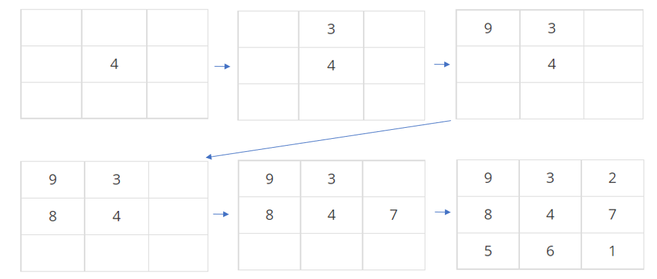 채우는 과정을 예시 입력 1번을 통해 확인하겠습니다.