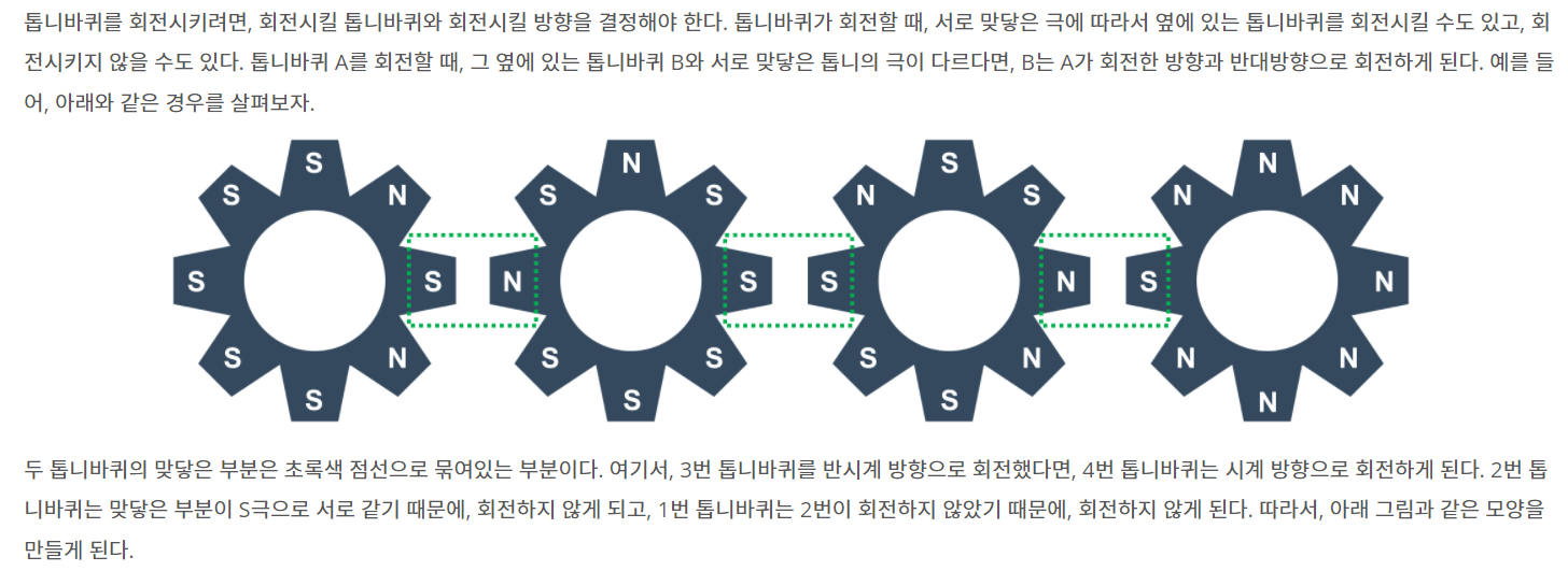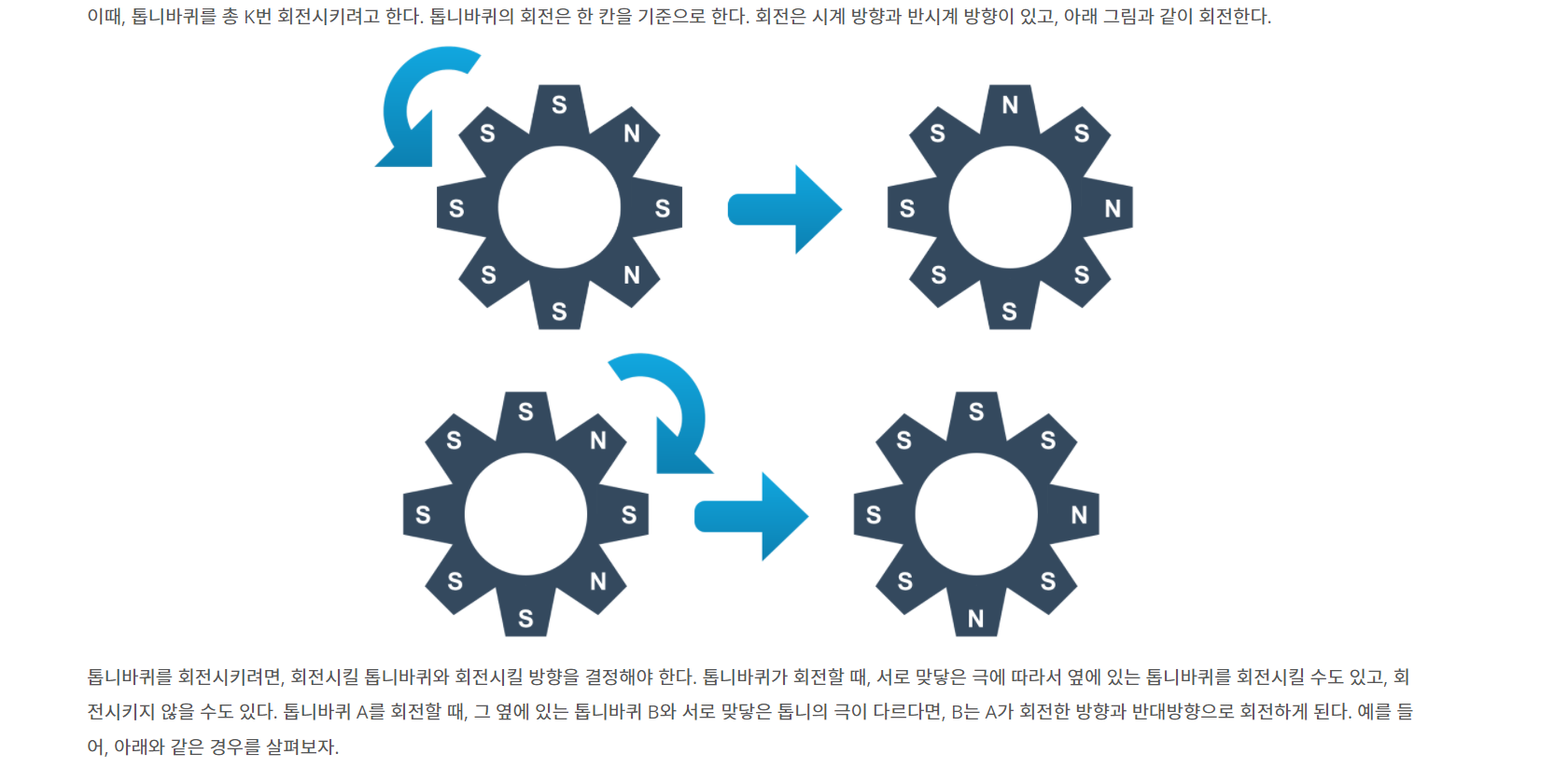 그리고 톱니바퀴가 시계방향으로 돌아가면 (1,2,3,4,5,6,7,8) -> (8,1,2,3,4,5,6,7) 순으로 움직입니다.