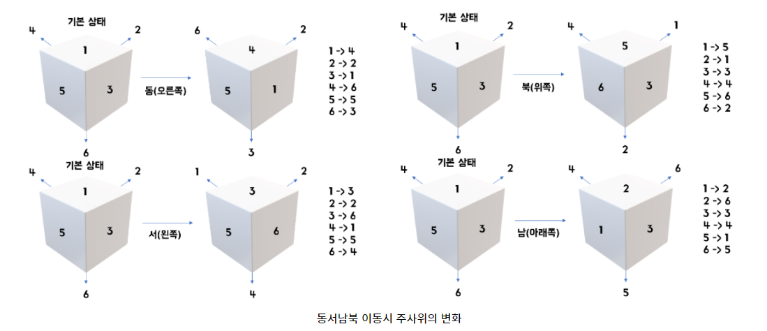 주사위를 동서남북으로 바꿀때, 값이 어떻게 변하는지를 나타냈습니다.