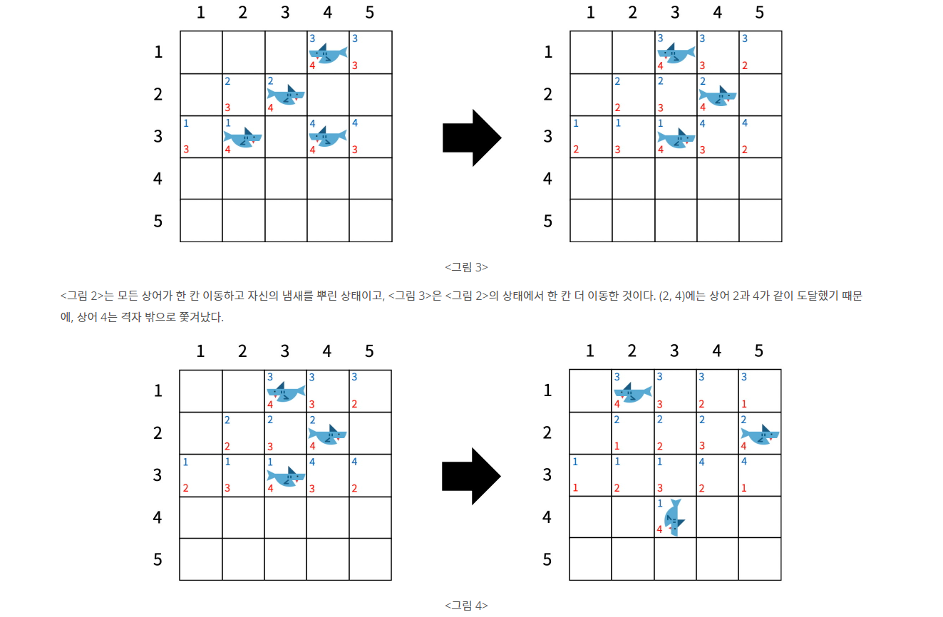 저는 상어 움직이기 -> 겹치는 상어 없애기 -> 냄새 없애기 -> 냄새 퍼트리기 순서로 만들었습니다.