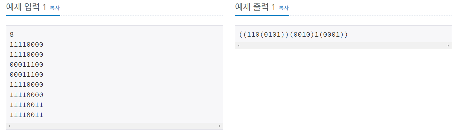 첫째 줄에는 영상의 크기를 나타내는 숫자 N 이 주어진다. N 은 언제나 2의 제곱수로 주어지며, 1 ≤ N ≤ 64의 범위를 가진다. 두 번째 줄부터는 길이 N의 문자열이 N개 들어온다. 각 문자열은 0 또