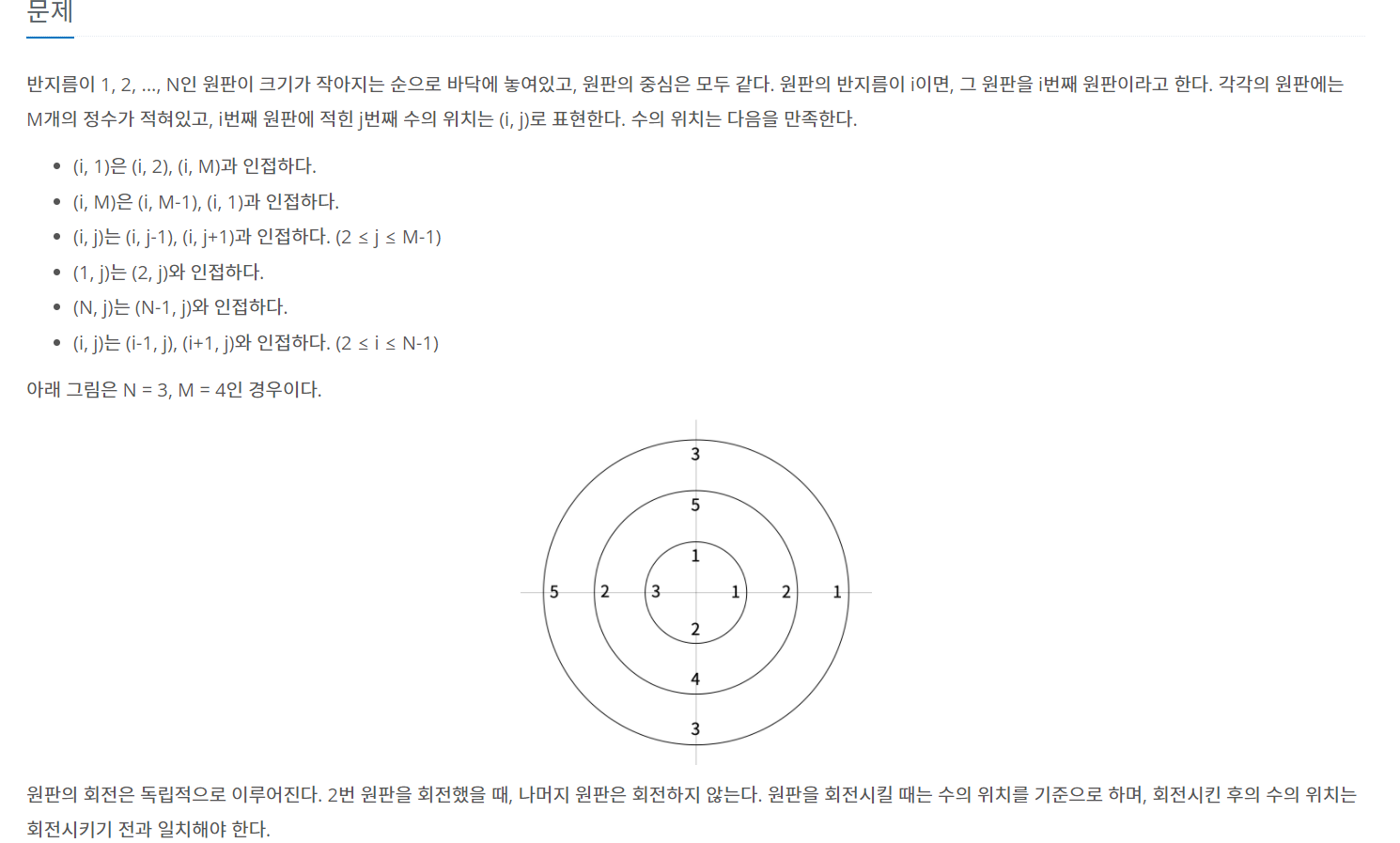 반지름이 1, 2, ..., N인 원판이 크기가 작아지는 순으로 바닥에 놓여있고, 원판의 중심은 모두 같다. 원판의 반지름이 i이면, 그 원판을 i번째 원판이라고 한다. 각각의 원판에는 M개의 정수가 적혀