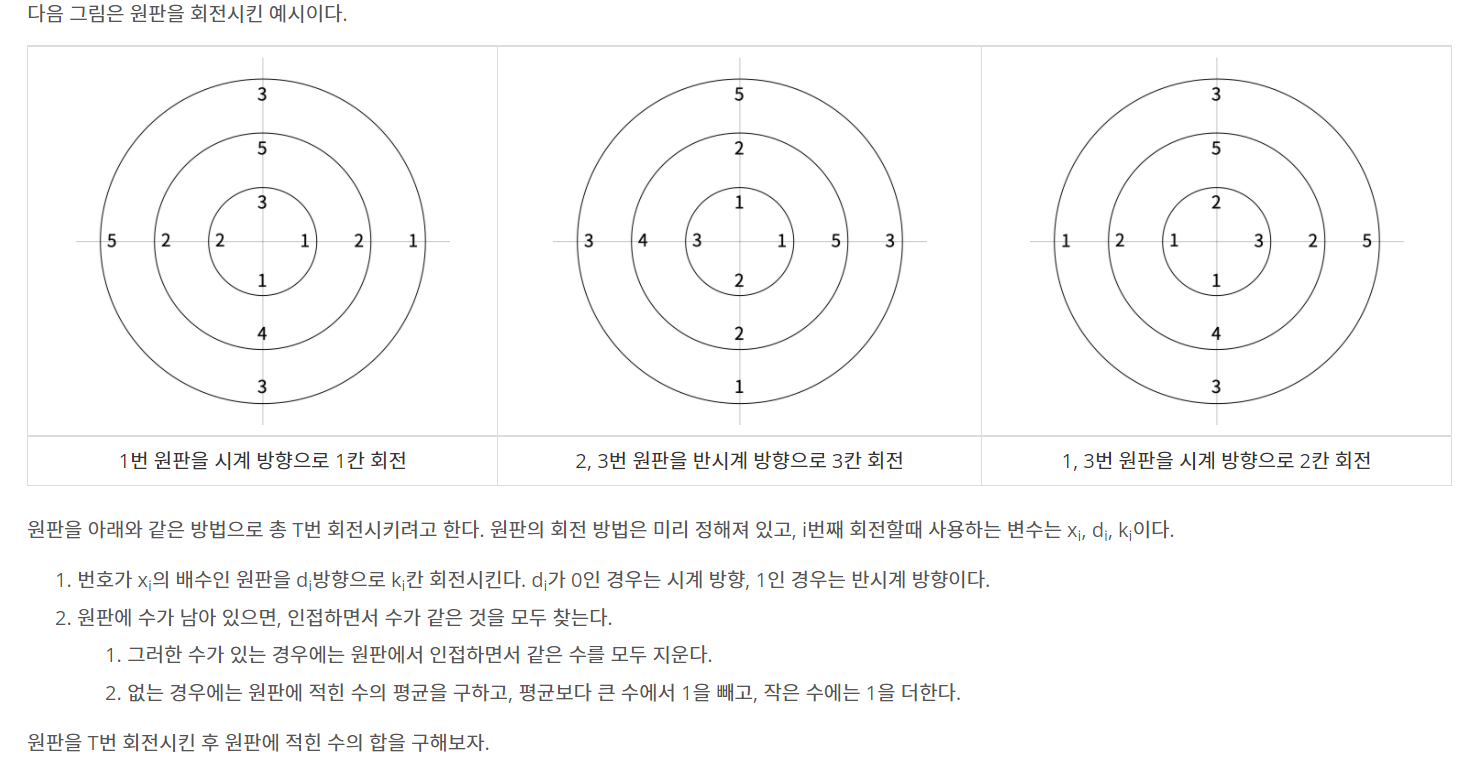 X는 돌릴 원판을 결정하는 수, D는 방향(시계 or 반시계), K는 돌릴 횟수, M은 원판 위 숫자의 갯수 입니다