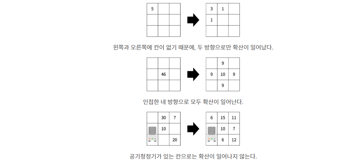 2. 미세먼지가 퍼진 곳의 갯수를 구한 다음 현재 칸에 얼마나 남았는지 저장합니다.
