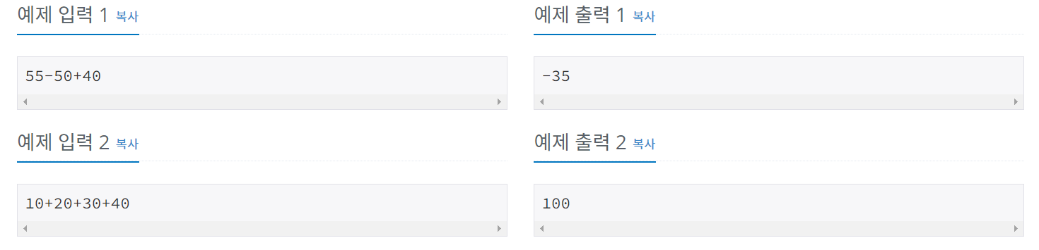 첫째 줄에 식이 주어진다. 식은 ‘0’~‘9’, ‘+’, 그리고 ‘-’만으로 이루어져 있고, 가장 처음과 마지막 문자는 숫자이다. 그리고 연속해서 두 개 이상의 연산자가 나타나지 않고, 5자리보다