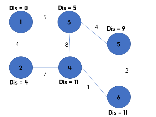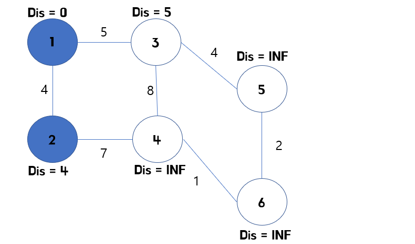 1. 시작 노드와 직접 연결된 모든 정점들의 거리를 비교해 업데이트 하고, 시작 노드를 방문한 노드로 바꿔줍니다.