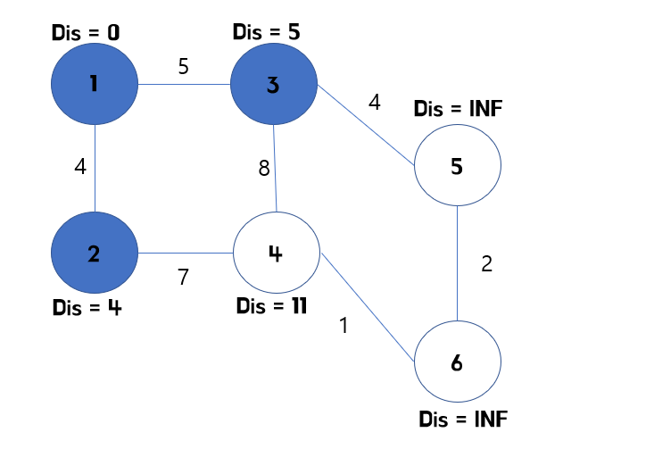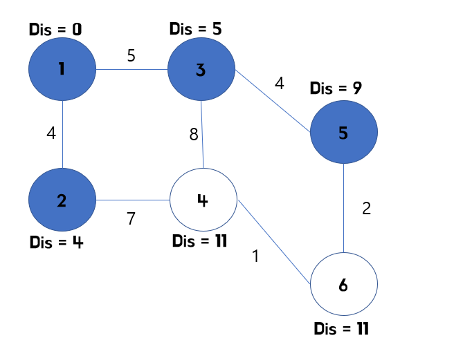 2번 점을 확인했다면, 이제 3번 정점을 확인해야합니다. 따라서 3번 정점에서 연결된 정점인 5번을 확인해주고, 5번의 최소 비용을 바꿔줍니다.