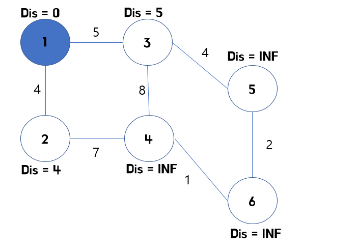 - 1. 시작 노드와 직접 연결된 모든 정점들의 거리를 비교해 업데이트 하고, 시작 노드를 방문한 노드로 바꿔줍니다.