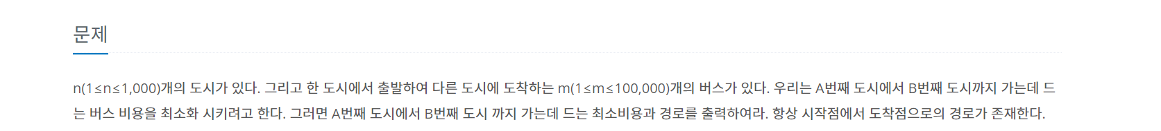 첫째 줄에 도시의 개수 n(1≤n≤1,000)이 주어지고 둘째 줄에는 버스의 개수 m(1≤m≤100,000)이 주어진다. 그리고 셋째 줄부터 m+2줄까지 다음과 같은 버스의 정보가 주어진다. 먼저 처음에는 그 버스