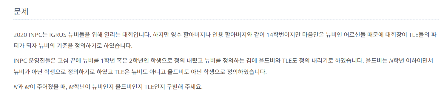 2020 INPC는 IGRUS 뉴비들을 위해 열리는 대회입니다. 하지만 영수 할아버지나 인용 할아버지와 같이 14학번이지만 마음만은 뉴비인 어르신들 때문에 대회장이 TLE들의 파티가 되자 뉴비의 기준을 정