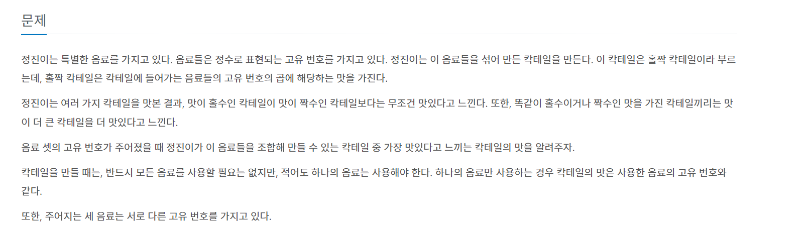 정진이는 특별한 음료를 가지고 있다. 음료들은 정수로 표현되는 고유 번호를 가지고 있다. 정진이는 이 음료들을 섞어 만든 칵테일을 만든다. 이 칵테일은 홀짝 칵테일이라 부르는데, 홀짝 칵