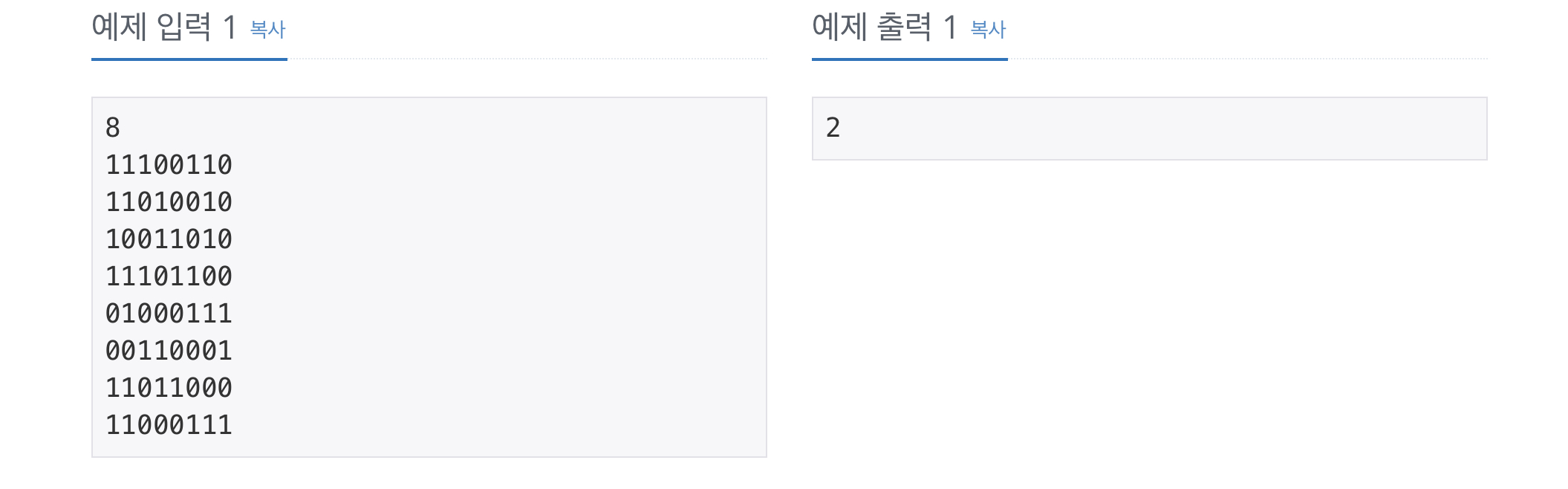 첫 줄에는 한 줄에 들어가는 방의 수 n(1 ≤ n ≤ 50)이 주어지고, 다음 n개의 줄의 각 줄마다 0과 1이 이루어진 길이가 n인 수열이 주어진다. 0은 검은 방, 1은 흰 방을 나타낸다.