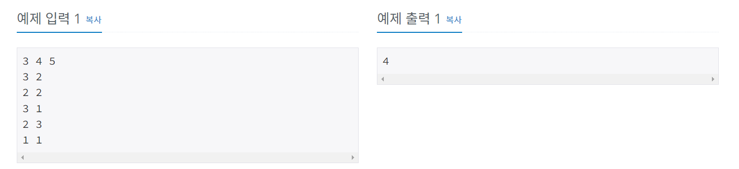 첫째 줄에 통로의 세로 길이 N(1 ≤ N ≤ 100)과 가로 길이 M(1 ≤ M ≤ 100) 그리고 음식물 쓰레기의 개수 K(1 ≤ K ≤ N×M)이 주어진다. 그리고 다음 K개의 줄에 음식물이 떨어진 좌표 (r, c)가 주어진다