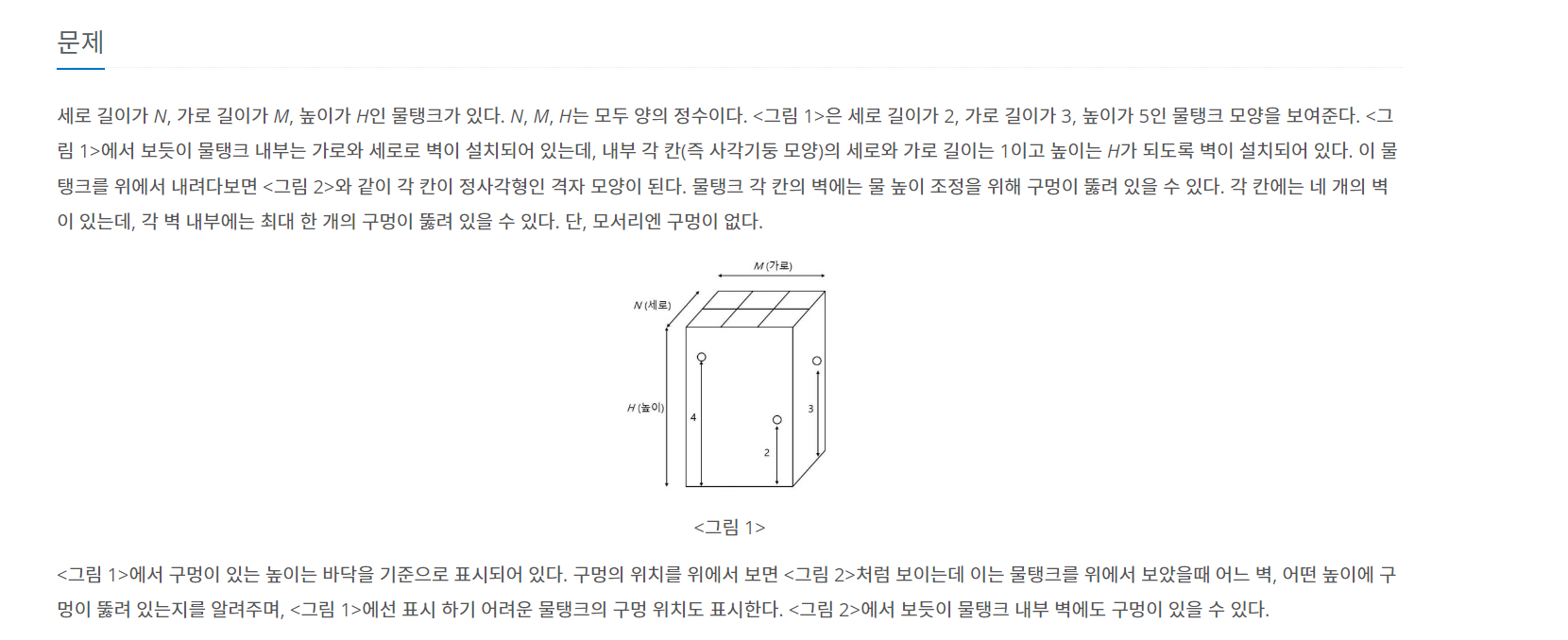 세로 길이가 N, 가로 길이가 M, 높이가 H인 물탱크가 있다. N, M, H는 모두 양의 정수이다. <그림 1>은 세로 길이가 2, 가로 길이가 3, 높이가 5인 물탱크 모양을 보여준다. <그림 1>에서 보듯이 물탱크