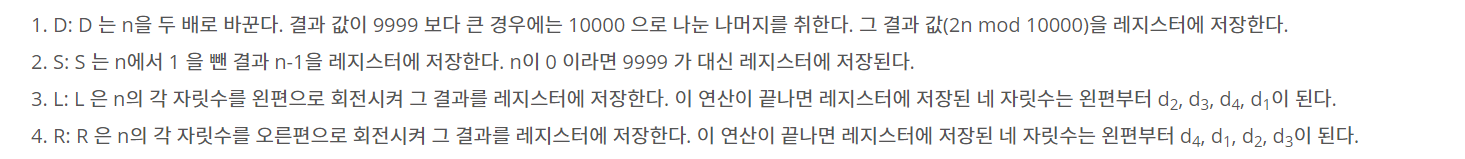 네 개의 명령어 D, S, L, R 을 이용하는 간단한 계산기가 있다. 이 계산기에는 레지스터가 하나 있는데, 이 레지스터에는 0 이상 10,000 미만의 십진수를 저장할 수 있다. 각 명령어는 이 레지스터에