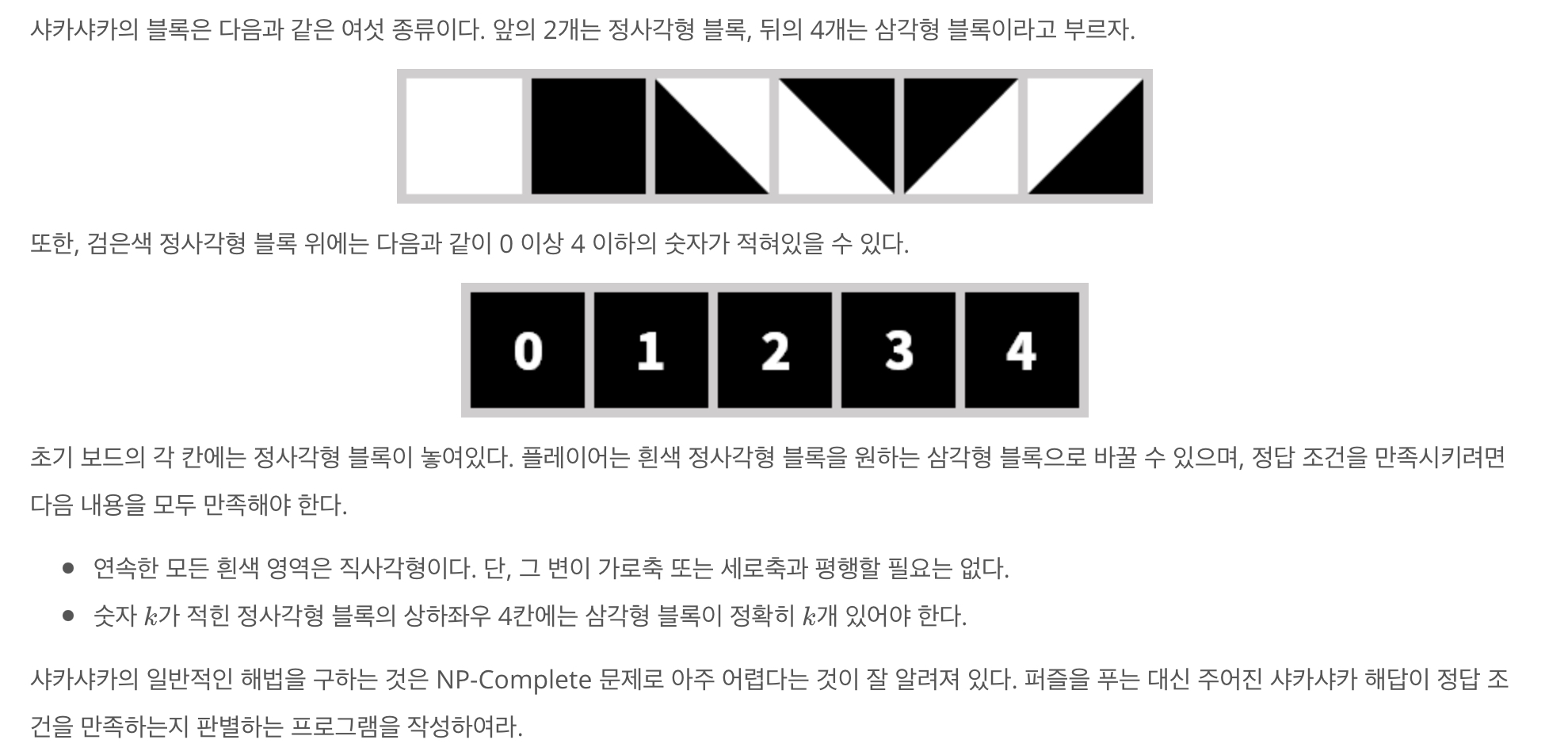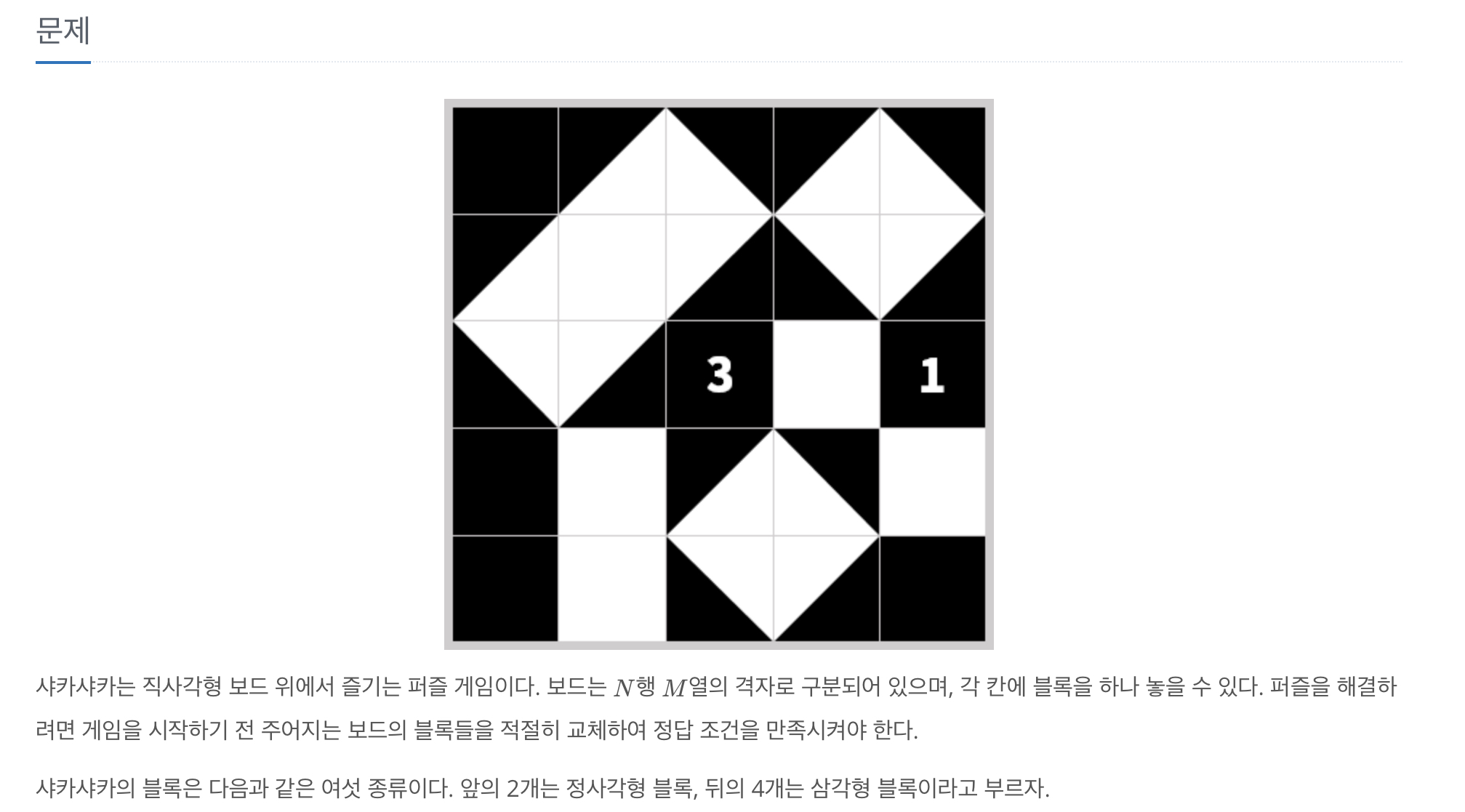 샤카샤카는 직사각형 보드 위에서 즐기는 퍼즐 게임이다. 보드는 \(N\)행 \(M\)열의 격자로 구분되어 있으며, 각 칸에 블록을 하나 놓을 수 있다. 퍼즐을 해결하려면 게임을 시작하기 전 주어지는