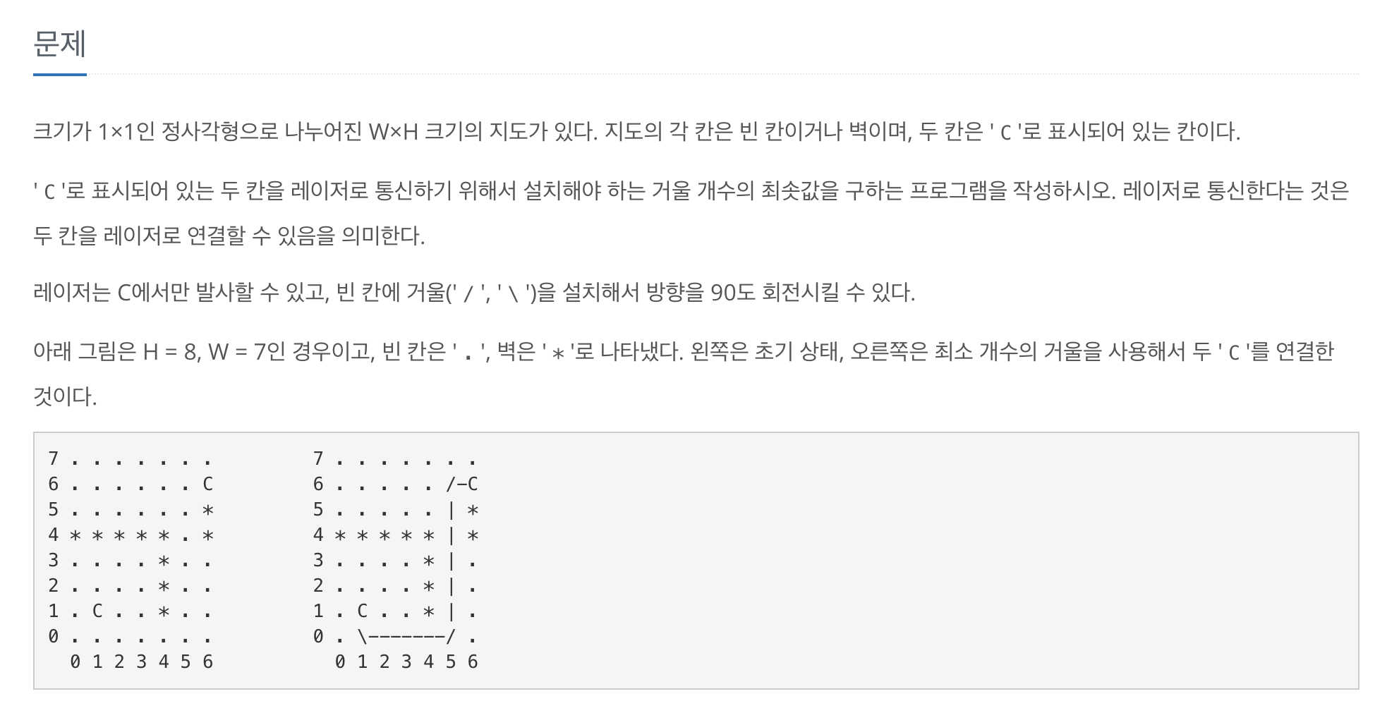 크기가 1×1인 정사각형으로 나누어진 W×H 크기의 지도가 있다. 지도의 각 칸은 빈 칸이거나 벽이며, 두 칸은 'C'로 표시되어 있는 칸이다. 'C'로 표시되어 있는 두 칸을 레이저로 통신하기 위해서