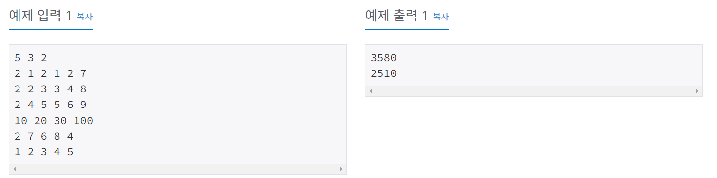 첫째 줄에 입력층의 입력 크기 $N$, 은닉층의 인공 신경 개수 $M$, 출력값을 계산해야 하는 횟수 $Q$가 공백으로 구분되어 주어진다. $(1 \leq N,M,Q \leq 2\,000)$ 둘째 줄부터 $M$번째 줄에 걸쳐 은닉층의