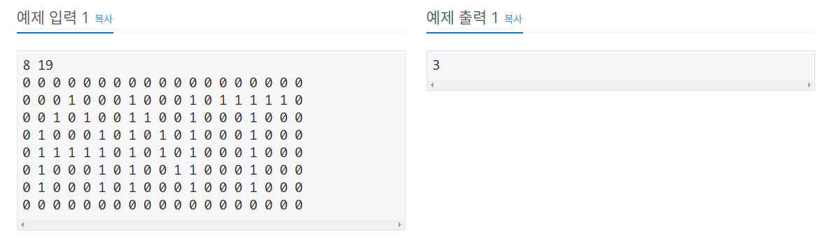 0과 1로 이루어진 map에서 1로만 이루어진 영역을 찾는 문제였습니다. 다른 문제와는 다르게 대각선까지 포함한 8방향 탐색을 해야됨을 유의했다면 쉽게 풀 수 있던 문제입니다.