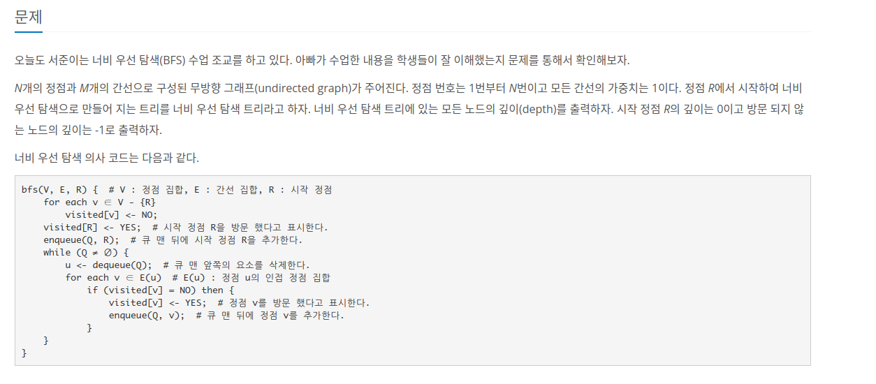 양방향 그래프와 시작점이 주어질 때, 1~N번까지 깊이를 구하는 문제입니다.