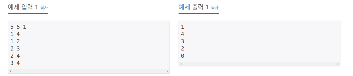 첫째 줄에 정점의 수 N (5 ≤ N ≤ 100,000), 간선의 수 M (1 ≤ M ≤ 200,000), 시작 정점 R (1 ≤ R ≤ N)이 주어진다. 다음 M개 줄에 간선 정보 u v가 주어지며 정점 u와 정점 v의 가중치 1인 양