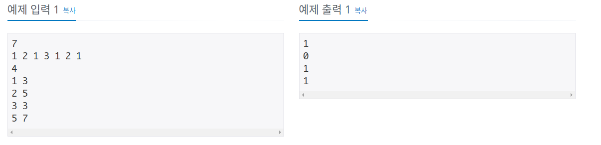 총 M개의 줄에 걸쳐 홍준이의 질문에 대한 명우의 답을 입력으로 주어진 순서에 따라서 출력한다. 팰린드롬인 경우에는 1, 아닌 경우에는 0을 출력한다.