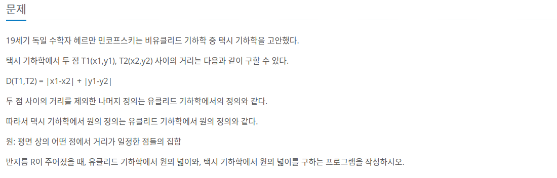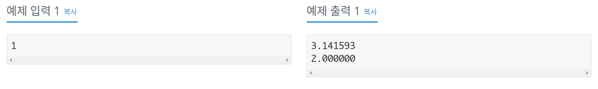 첫째 줄에는 유클리드 기하학에서 반지름이 R인 원의 넓이를, 둘째 줄에는 택시 기하학에서 반지름이 R인 원의 넓이를 출력한다. 정답과의 오차는 0.0001까지 허용한다.