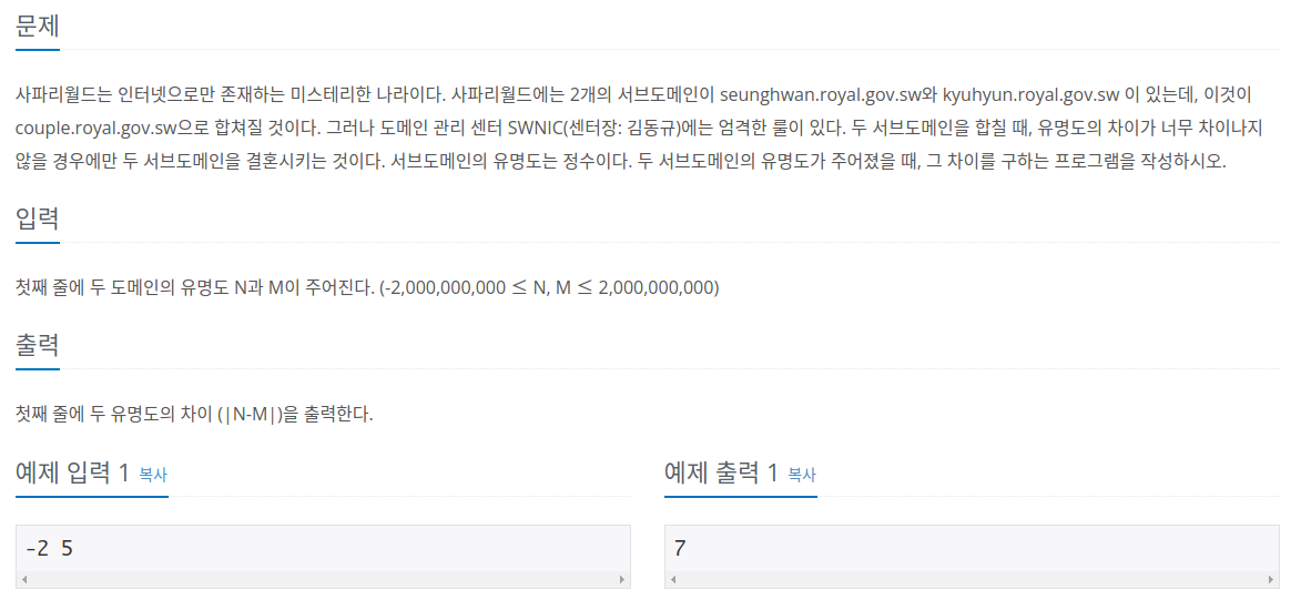 첫째 줄에 두 도메인의 유명도 N과 M이 주어진다. (-2,000,000,000 ≤ N, M ≤ 2,000,000,000)