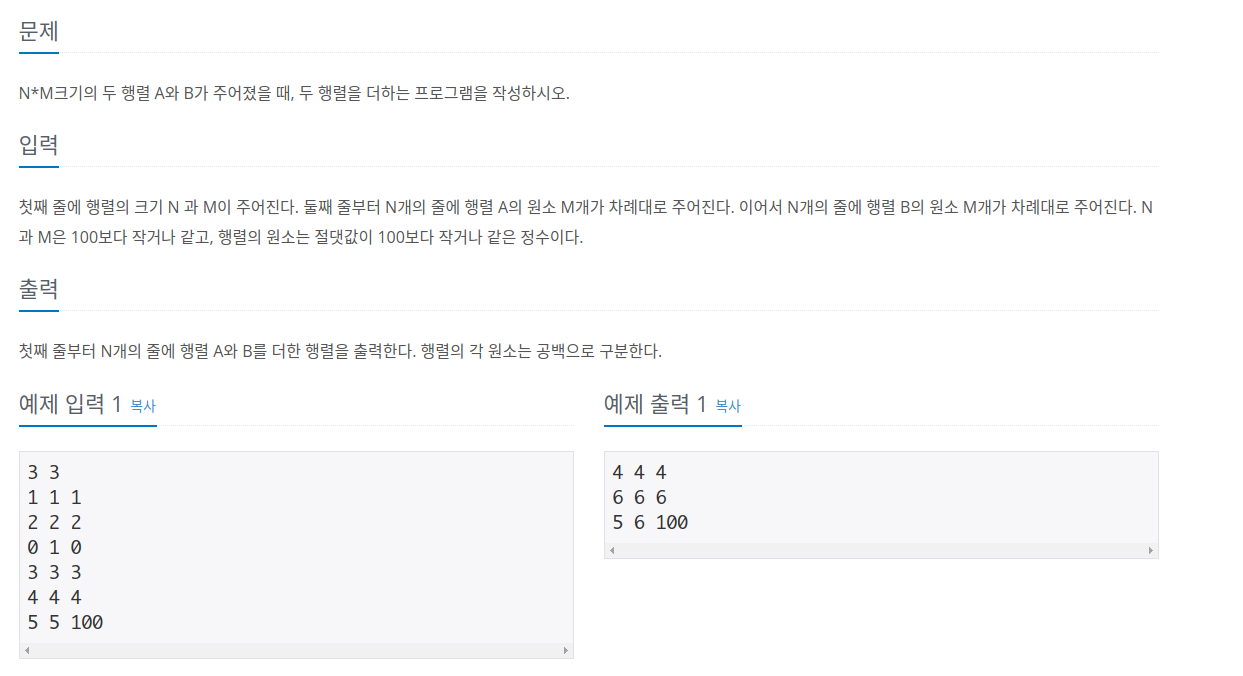 2차원 배열 2개를 이용해 행렬을 입력 받은 뒤, 합을 출력하는 간단한 문제입니다.