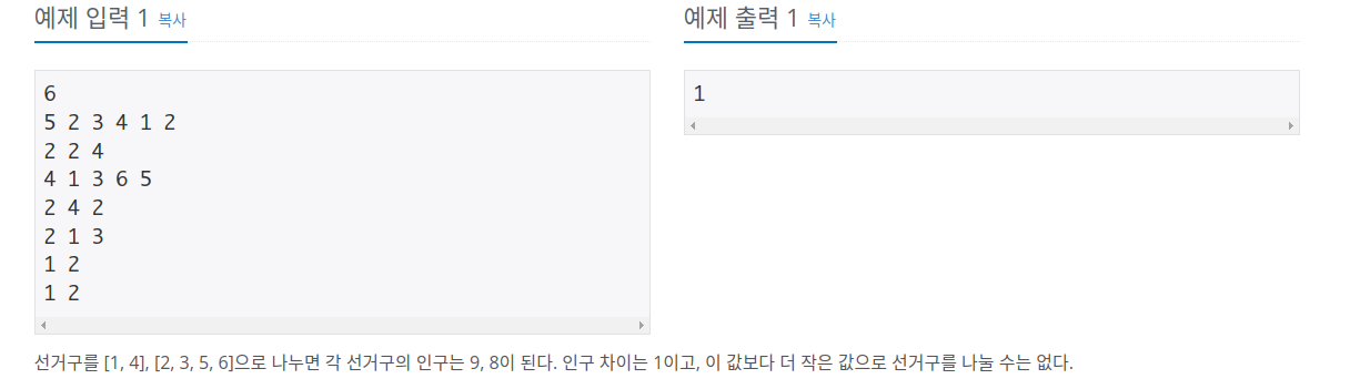선거구를 [1, 4], [2, 3, 5, 6]으로 나누면 각 선거구의 인구는 9, 8이 된다. 인구 차이는 1이고, 이 값보다 더 작은 값으로 선거구를 나눌 수는 없다.