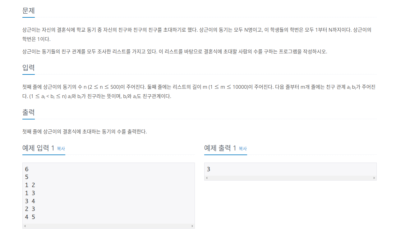예제 1의 경우 2와 3은 상근이의 친구이다. 또, 3과 4는 친구이기 때문에, 4는 상근이의 친구의 친구이다. 5와 6은 친구도 아니고, 친구의 친구도 아니다. 따라서 2, 3, 4 3명의 친구를 결혼식에 초대