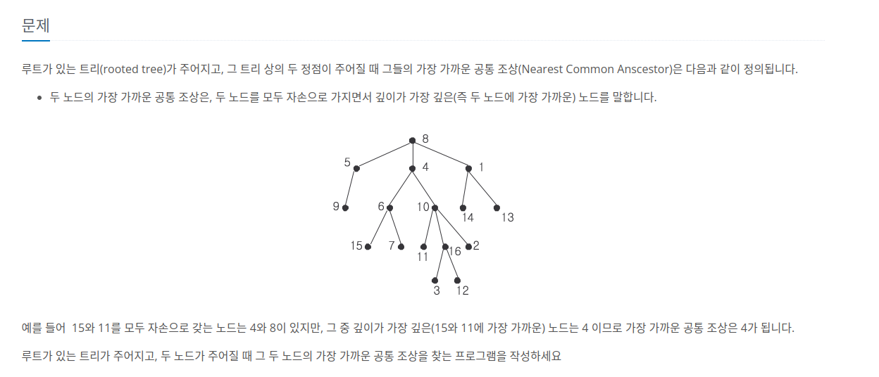 루트가 있는 트리(rooted tree)가 주어지고, 그 트리 상의 두 정점이 주어질 때 그들의 가장 가까운 공통 조상(Nearest Common Anscestor)은 다음과 같이 정의됩니다. 두 노드의 가장 가까운 공통 조상은, 두