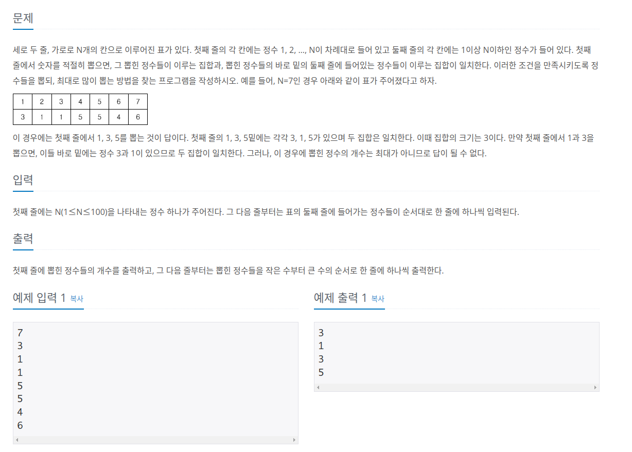 세로 두 줄, 가로로 N개의 칸으로 이루어진 표가 있다. 첫째 줄의 각 칸에는 정수 1, 2, …, N이 차례대로 들어 있고 둘째 줄의 각 칸에는 1이상 N이하인 정수가 들어 있다. 첫째 줄에서 숫자를 적절