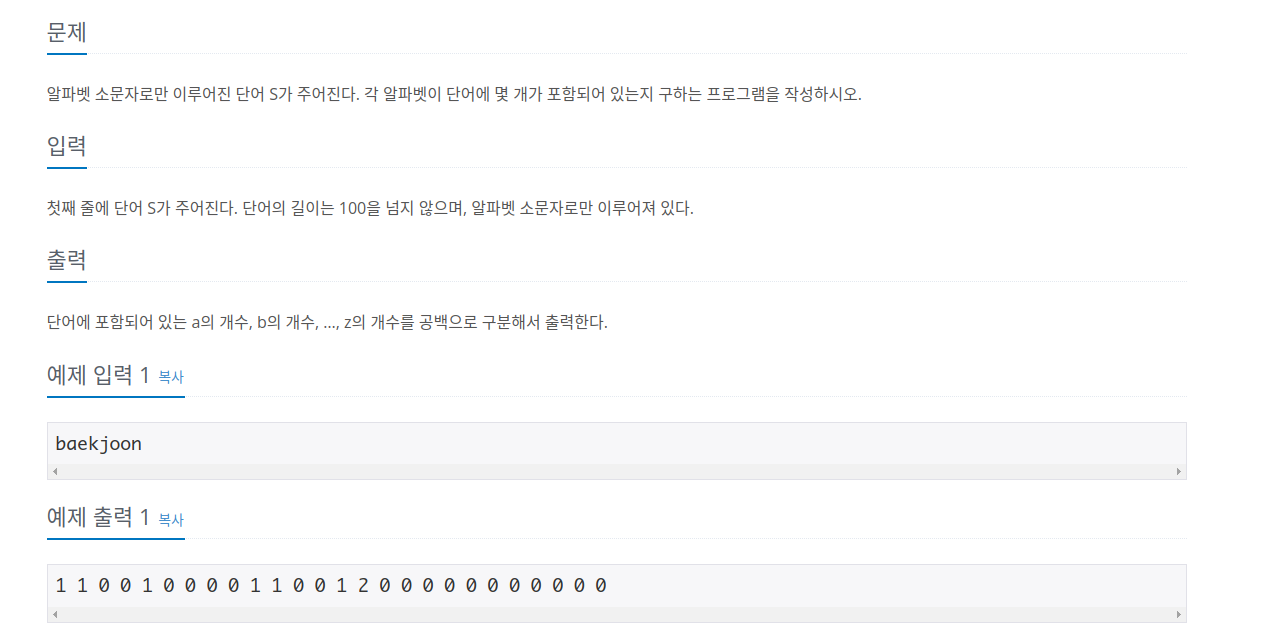 문자열이 주어진 뒤, 주어진 문자열에서 알파벳이 각각 몇개가 들어있는지를 구하는 문제입니다.