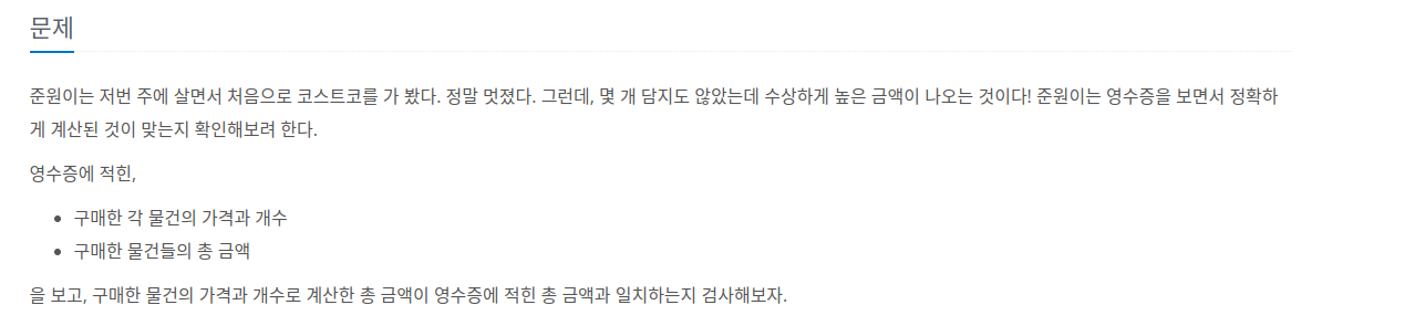 영수증과 금액이 주어지고, 둘의 값이 맞는지를 확인하는 문제입니다.