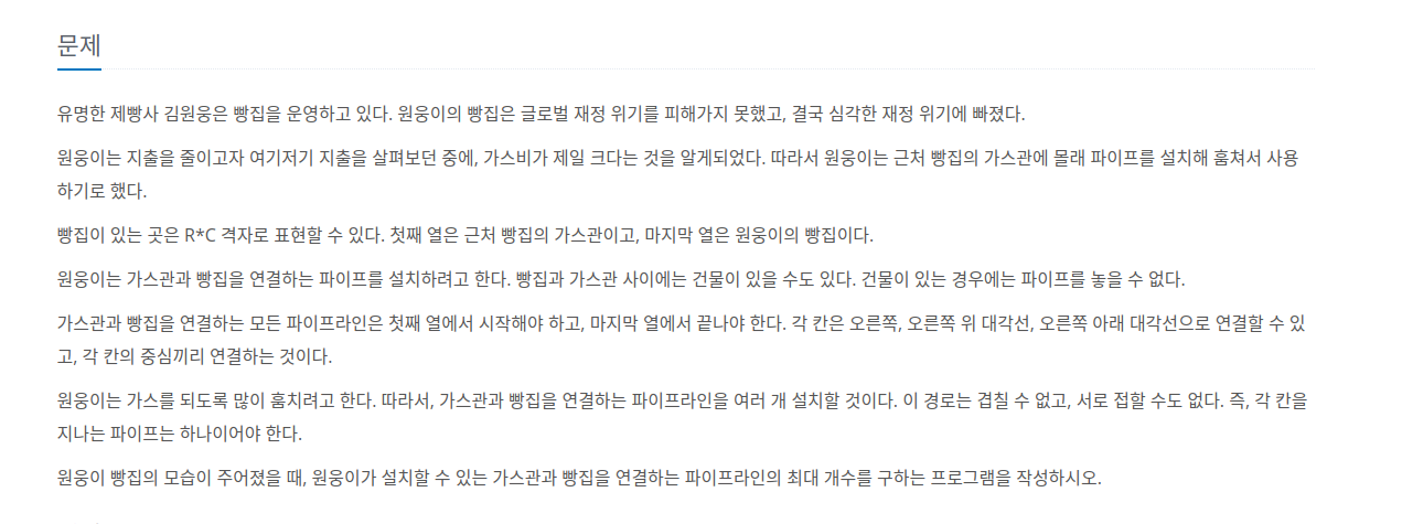 첫번째 열이 다른 빵집, 마지막 열이 자신의 열일 때, 파이프라인을 최대 몇개까지 이을 수 있는지 구하는 문제입니다.