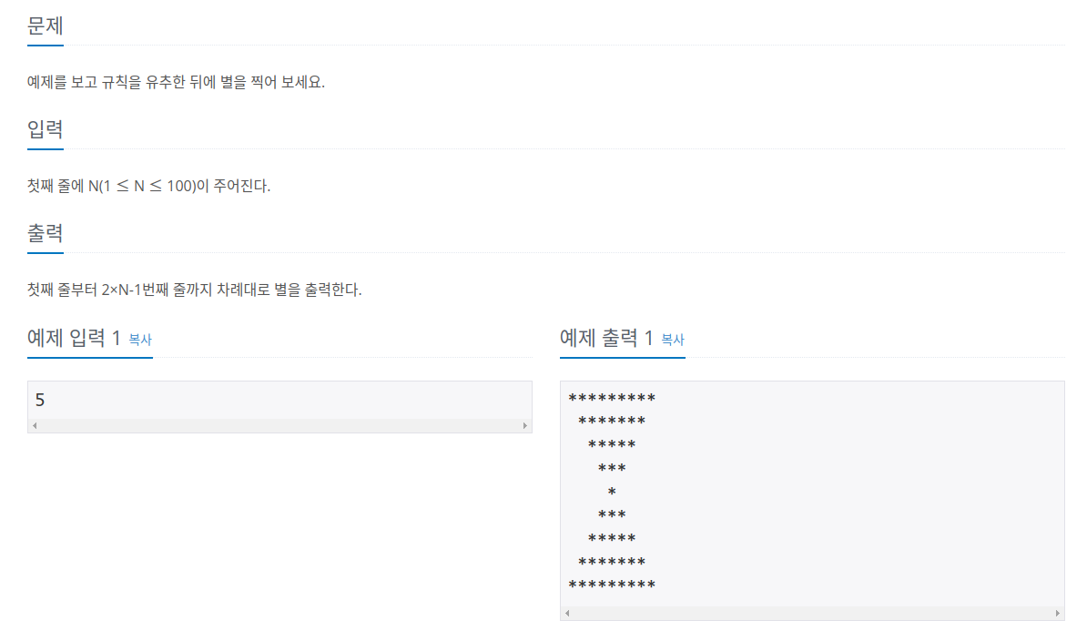 첫째 줄부터 2×N-1번째 줄까지 차례대로 별을 출력한다.