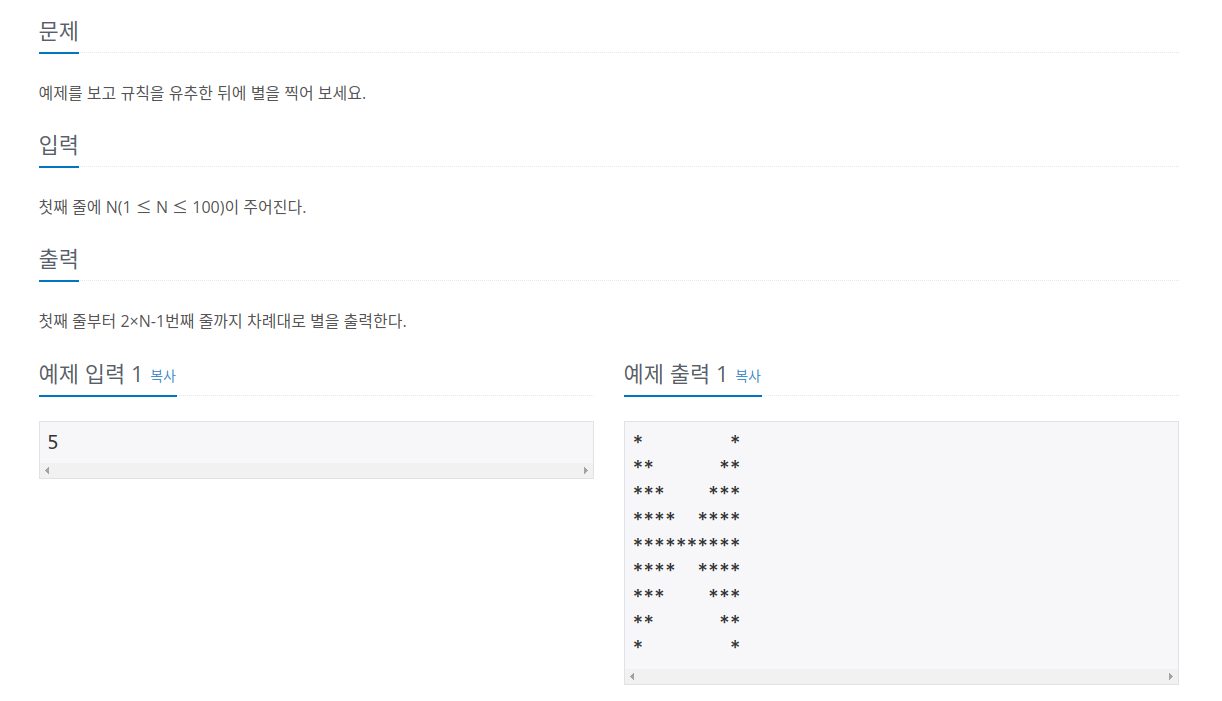 첫째 줄부터 2×N-1번째 줄까지 차례대로 별을 출력한다.