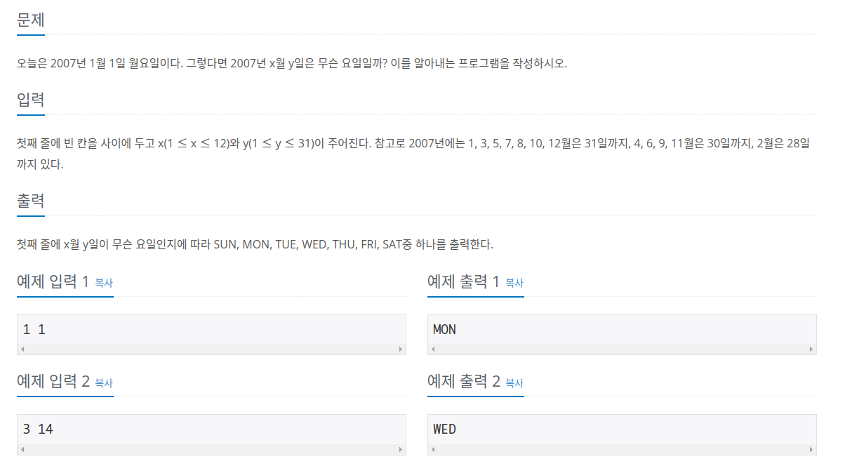날짜를 입력받아 요일을 출력하는 문제입니다.