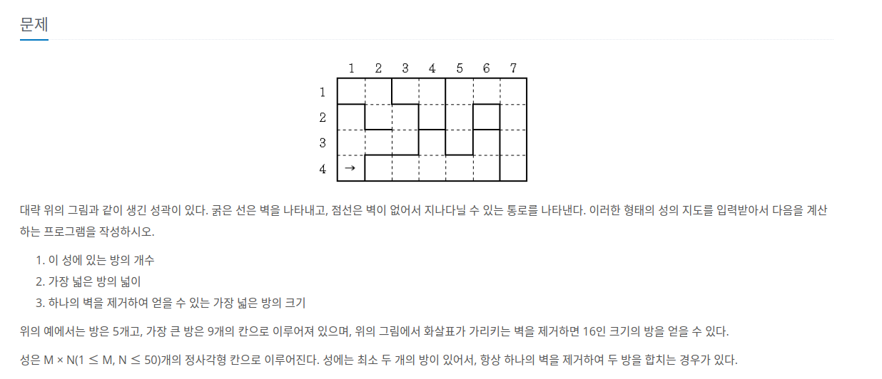 서쪽은 1, 북쪽은 2, 동쪽은 4, 남쪽은 8의 값을 가질 때, 한 칸마다 수가 주어지는데 해당 하는 수를 통해 어디가 벽으로 막혀있는지를 알 수 있습니다.
