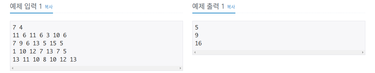 첫째 줄에 두 정수 N, M이 주어진다. 다음 M개의 줄에는 N개의 정수로 벽에 대한 정보가 주어진다. 벽에 대한 정보는 한 정수로 주어지는데, 서쪽에 벽이 있을 때는 1을, 북쪽에 벽이 있을 때는 2를,