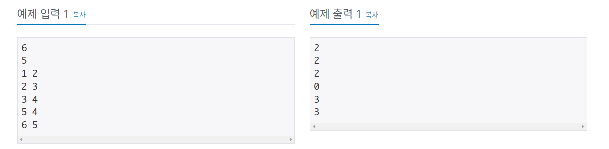 첫 줄에는 물건의 개수 N 이 주어지고, 둘째 줄에는 미리 측정된 물건 쌍의 개수 M이 주어진다. 단, 5 ≤ N ≤ 100 이고, 0 ≤ M ≤ 2,000이다. 다음 M개의 줄에 미리 측정된 비교 결과가 한 줄에 하나씩