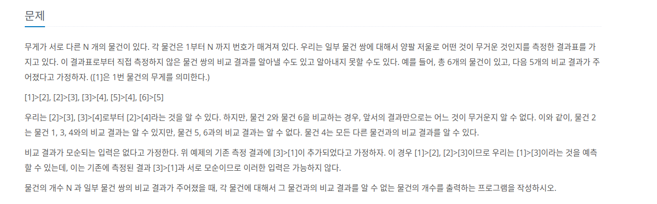 1~N번까지 무게의 비교가 주어질 때, X번 물건과 비교할 수 없는 물건이 몇개인지를 구하는 문제였습니다.